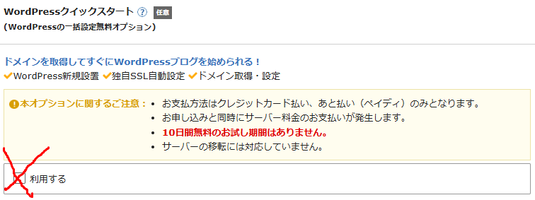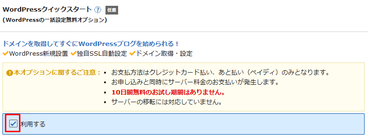 WordPressクイックスタート「✅️利用する」の場合は「10日間無料お試し利用」は対象外になります。